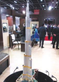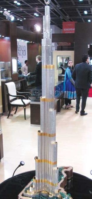 عرضت احدى شركات صناعة المجوهرات في اسبوع دبي للمجوهرات 2012 الذي يقام حالياً، مجسماً لبرج خليفة مطلي بالذهب تبلغ قيمته 6 ملايين درهم.