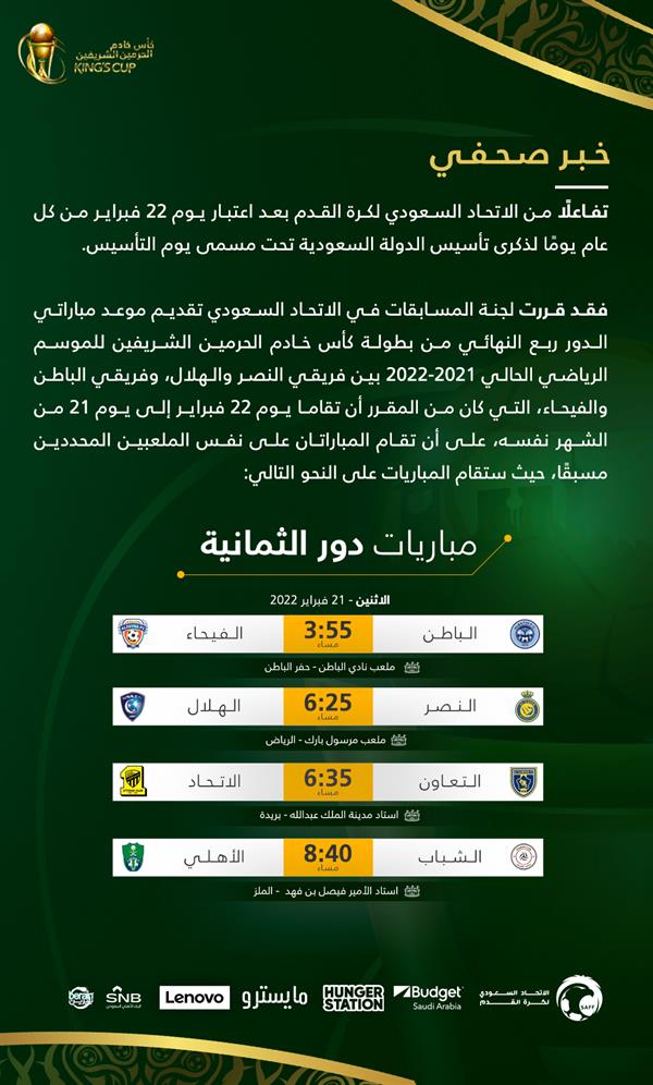 أعلنت لجنة المسابقات باتحاد الكرة، تقديم مباراتي الدور ربع النهائي من كأس خادم الحرمين الشريفين المقرر إقامتهما يوم 22 إلى 21 فبراير.
