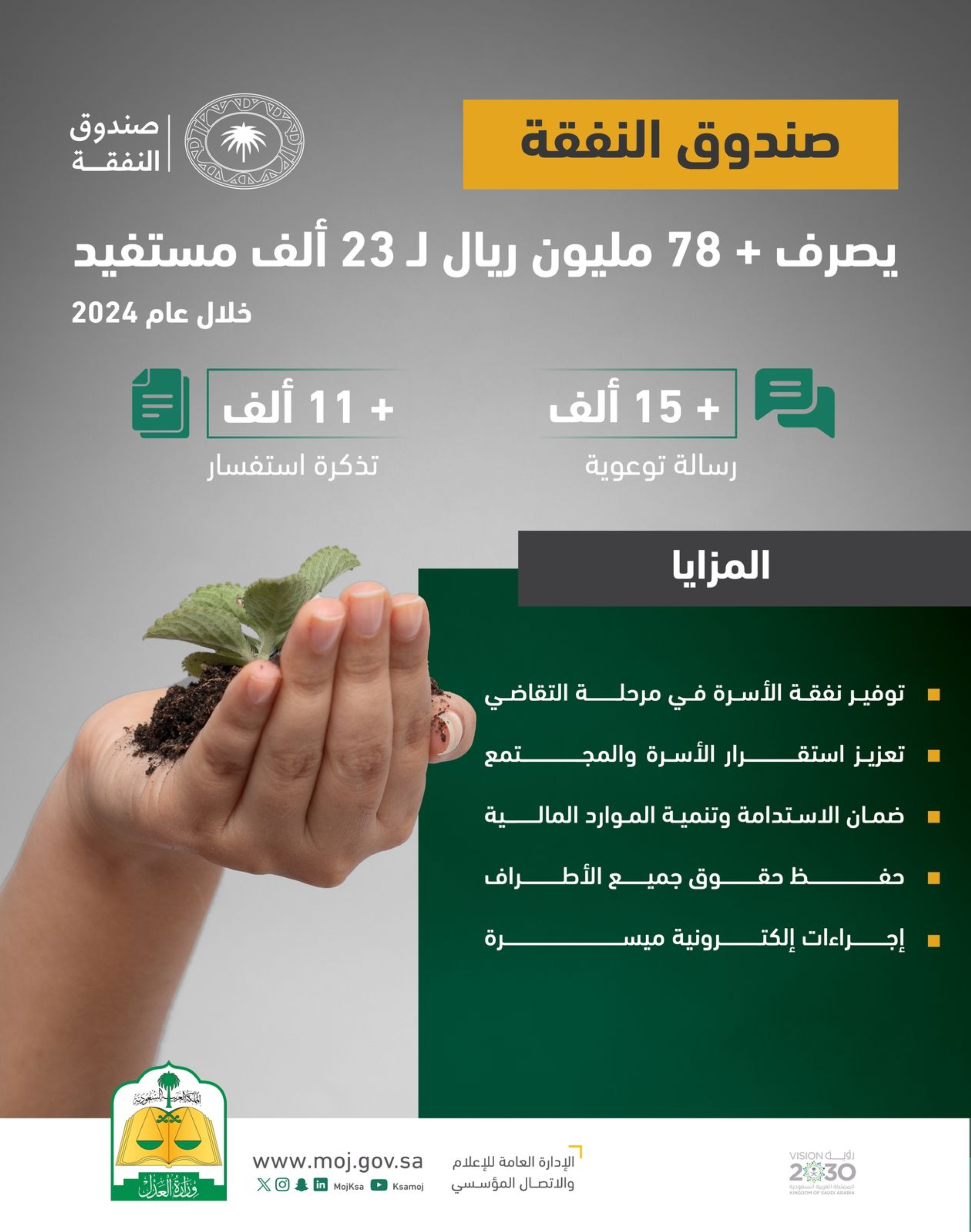 أسهم صندوق النفقة في وزارة العدل في استقرار العديد من الأسر ماليًا عبر الانتظام في صرف النفقة الشهرية دون تأخير، حيث قام خلال عام 2024 بصرف أكثر من 78 مليون ريال لأكثر من 23 ألف مستفيد.