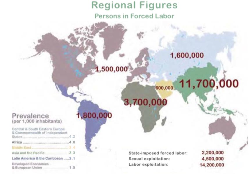 يوجد حوالي 20.9 مليون من العبيد حول العالم، وذلك وفقا لأرقام صادرة من منظمة العمل الدولية، وهذا يعني أنه في عصر العولمة الطاغية والتقدم التكنولوجي أناس لا يزالون في وضع الإجبار على العمل دون إرادتهم، دون حق المطالبة بتعويضات مقابل ما يقومون به من خدمات.