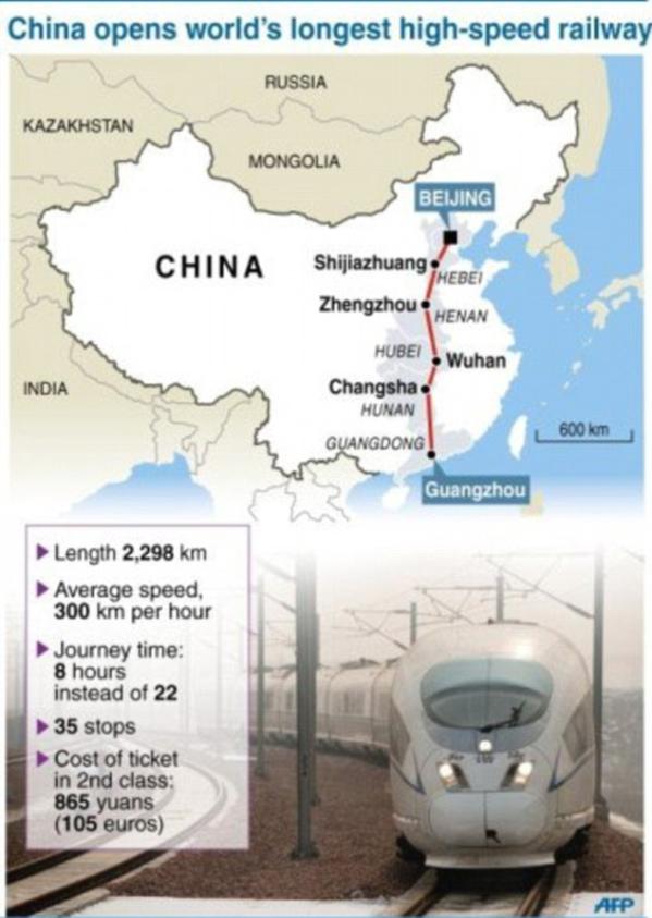أطول خط للسكة الحديدية فائق السرعة في العالم يربط بين بكين و قوانغتشو المركز التجاري الجنوبي .