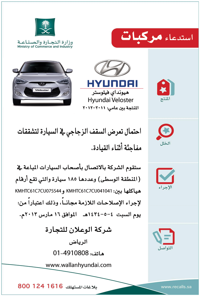 أعلنت وزارة التجارة والصناعة استدعاء سيارات هيونداي "فيلوستر" المنتجة بين عامي 2011/ 2012م اعتبارا من اليوم، وذلك لاكتشاف مشاكل في السقف الزجاجي للسيارات، ما قد يؤدي لحدوث تشققات مفاجئة به أثناء القيادة.