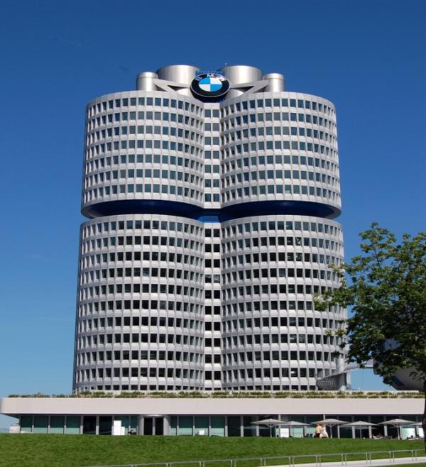 مبنى شركة "بي إم دبليو" في مدينة ميونخ الألمانية ، وهو مُصمم على شكل محرك رباعي الإسطوانات ، ويبلغ طوله 101 متراً واستغرق بناؤه 4 سنوات.