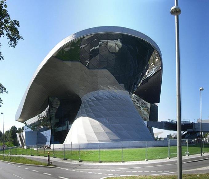 مبنى "BMW Welt“ مخروطي التصميم ، وهو المصنع الرئيسي لمجموعة "بي إم دبليو" ، والذي يقع بجوار المقر الرئيسي للشركة في ميونخ.