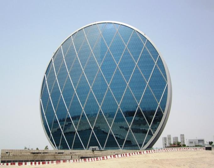 مبنى HQ لشركة "الدار" العقارية في "شاطىء الراحة" بأبو ظبي ، وهو أول مبنى دائري بالشرق الأوسط .