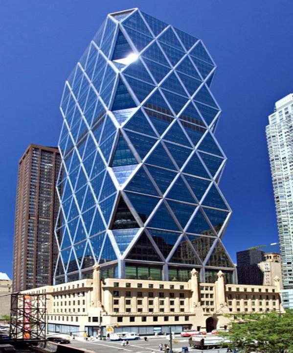 برج مؤسسة "“Hearst الإعلامية في مدينة مانهتن الأمريكية ، ويضم 46 طابقاً ، وهو مُصمم على شكل مًعين يحتوي على أطراف فولاذية مثلثة ، بهيكل زجاجي وأُطر معدنية. وقد حاز المبنى على جائزة "هاي رايز" المعمارية لعام 2008 ، فضلاً عن كونه يعتبر أول مبنى بحصل على التصنيف الذهبي من حيث الريادة في استهلاك الطاقة والتصميم البيئي.