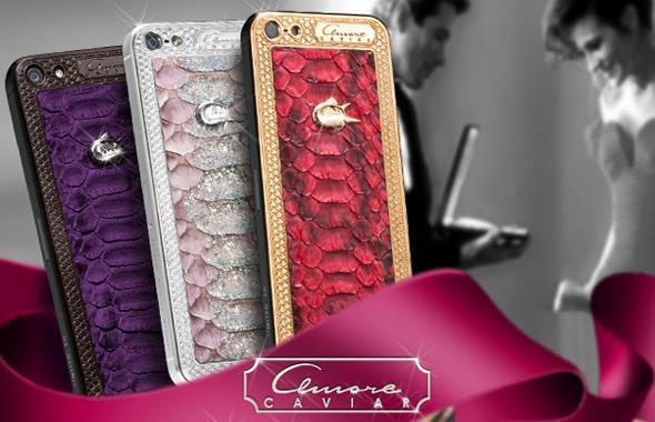 4- Caviar Amore Collection : يبدأ سعر هذا الجهاز من 4.200 دولار ، وهو عبارة عن ايفون 5 مغطى بالذهب وجلد ثعبان الاناكوندا وبسعة 16GB، اما الاغلى بسعر 5.800 دولار منقوش بالذهب من عيار 18 وجلد اناكوندا احمر مع تدرج من الالماس مع بطانة مخملية حمراء.