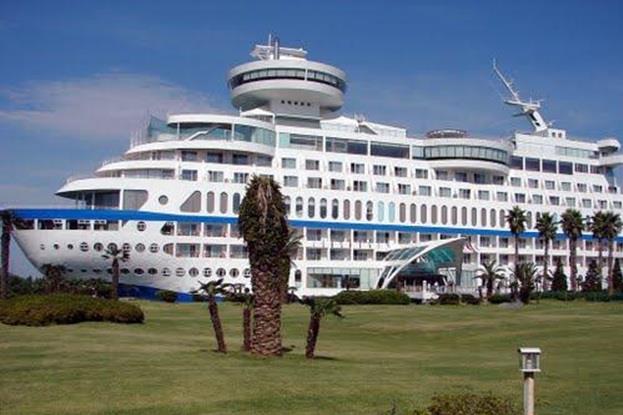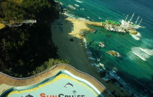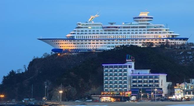 نشرت صحيفة "ديلي ميل" البريطانية صوراً لأول فندق في العالم يتم تصميمه على شكل سفينة معلقة على منحدر صخري بأحد المدن الساحلية في كوريا الجنوبية.