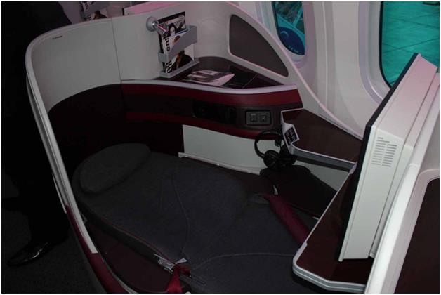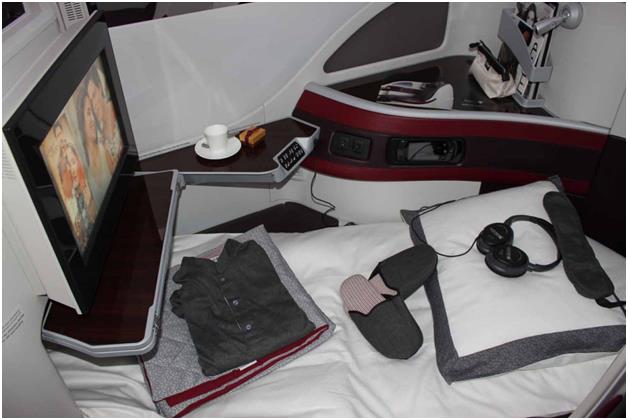 ويحصل مسافر درجة رجال الأعمال على متن "بوينج دريملاينر" التابعة للخطوط القطرية على طاقم نوم كامل.