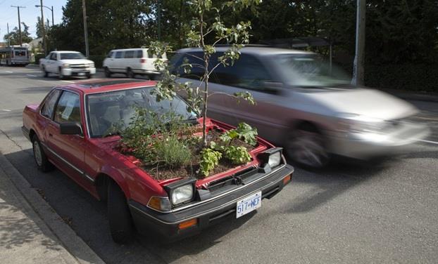 سيارة تحمل حديقة مزروعة مكان المحرك، تم تصميعها في مدينة "فانكوفر" الكندية، في إطار الترويج لبرنامج التحول الحضري هناك.