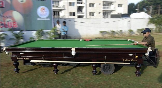 سيارة مصصمة على شكل طاولة بلياردو، ومزودة بثلاث عجلات، وتبلغ سرعتها 45 كيلومتراً في الساعة.