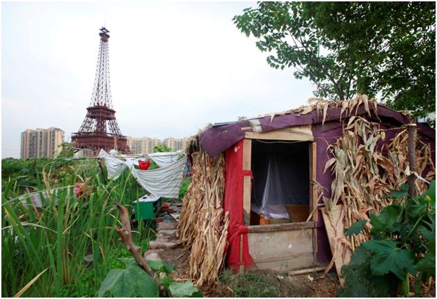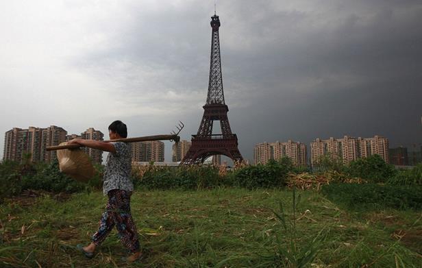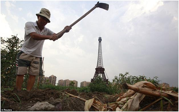 ويبلغ طول "برج إيفل" الصيني 108 متراً، وهو يظهر في العديد من الصور بخلفية مزارع محيطة بالمدينة، في مشهد نادر.