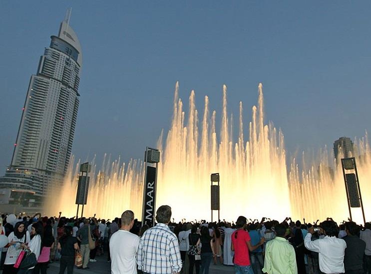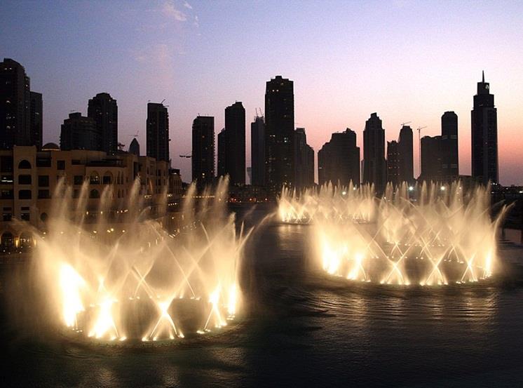 ويضم "دبي مول" نافورة دبي الراقصة، التي تقع في بحيرة برج خليفة التي تبلغ مساحتها 30 فداناً، والتي تقذف المياه إلى ارتفاع 150 متراً، أي ما يعادل ارتفاع مبنى يتكون من 50 طابقاً، وهي تتضمن خمس دوائر ذات أحجام مختلفة وقوسين مركزيين.