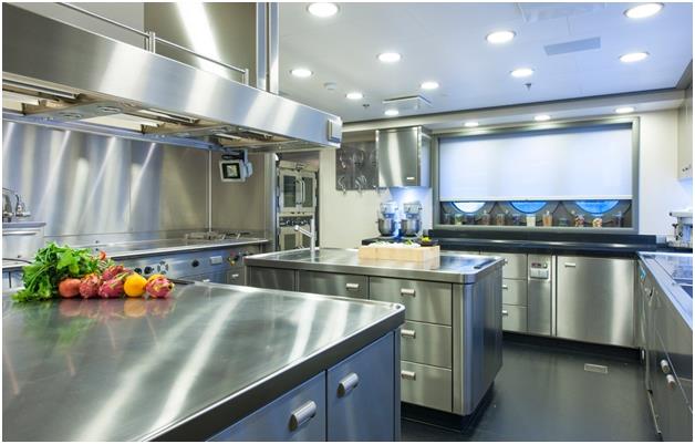 كما أن اليخت مزود بمطبخ بمساحة شاسعة مصمم من الستانلس ستيل مجهز بالكامل.