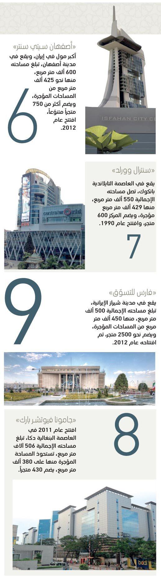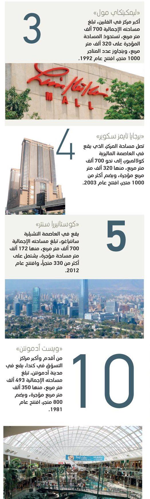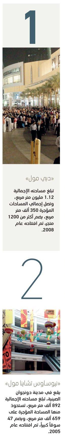 تصدّر "دبي مو" مراكز التسوّق العالمية من حيث المساحة الإجمالية، التي تبلغ 1.12 مليون متر مربع، فيما حلّ ثانياً في عدد المتاجر، والتي بلغت أكثر من 1200 متجر، في المقابل جاء مركز "نيوساوس تشاينا مول" في المرتبة الأولى من حيث المساحة المؤجرة، و"مركز فارس للتسوّق" في المرتبة الأولى في المتاجر، بحسب صحيفة "الإمارات اليوم".