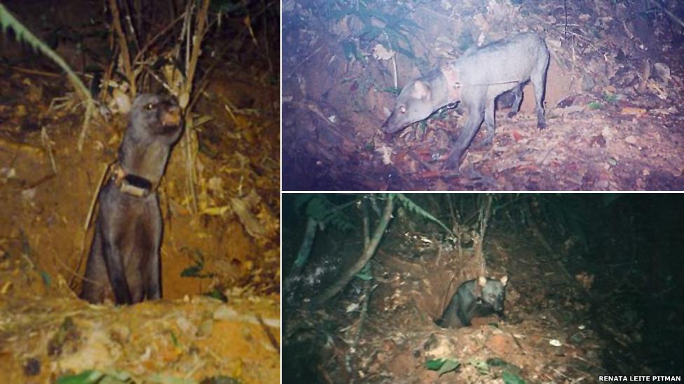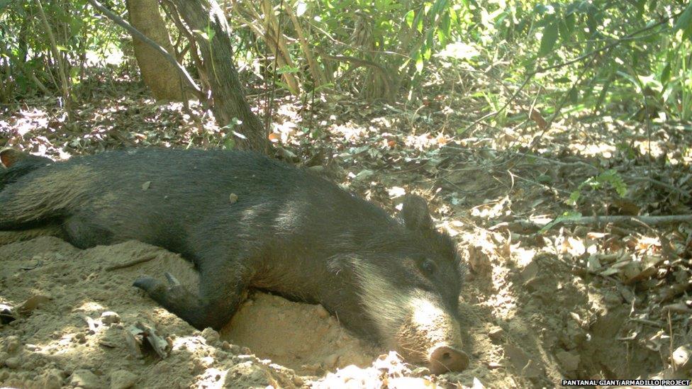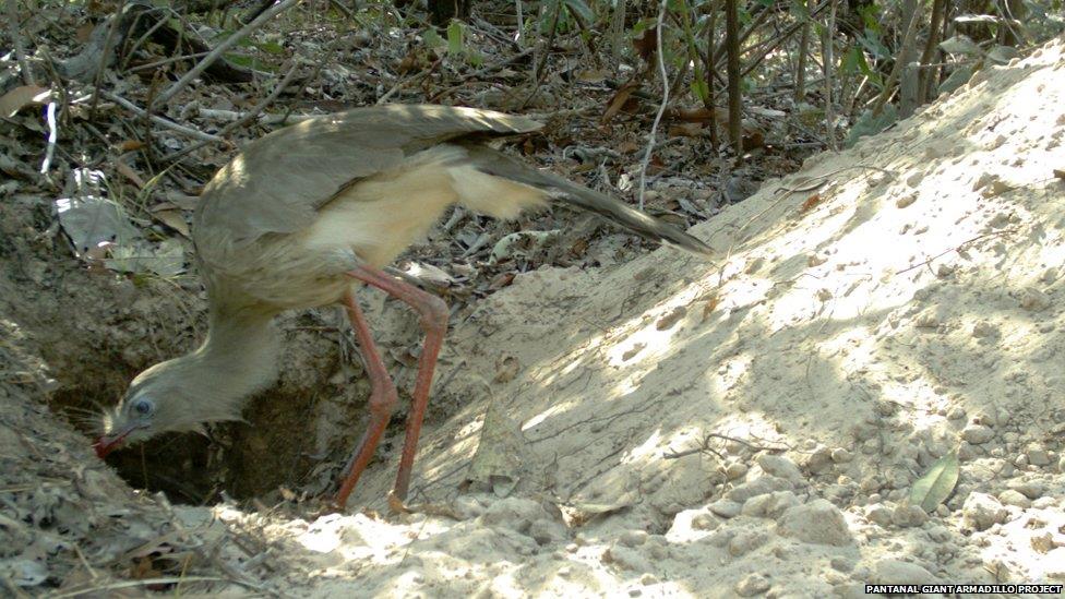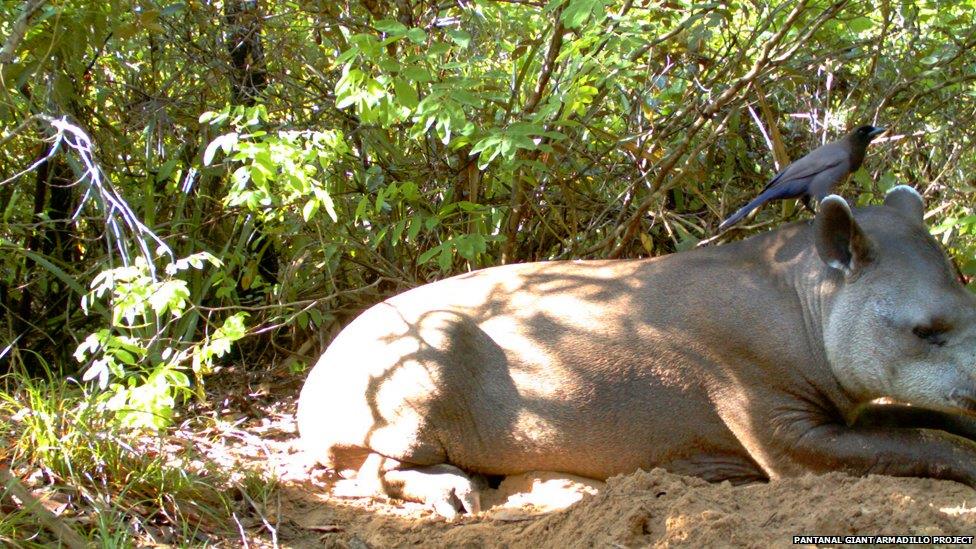 والتقطت الكاميرا أيضا صورا لحيوان التابير البرازيلي " يشبه الخنزير"، وبجانبه أحد أنواع الطيور، وهو يستريح على التلال الرملية التي تشكلت خارج الجحر بفعل عمليات الحفر التي يقوم بها المدرع.