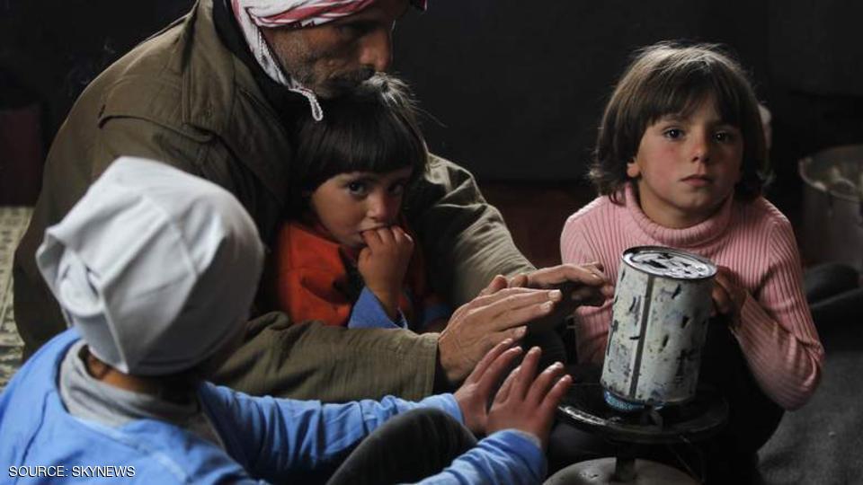 أطفال سوريون يحيطون بموقد يحاولون الحصول على الدفئ داخل خيمتهم في مخيم الزعتري بالأردن