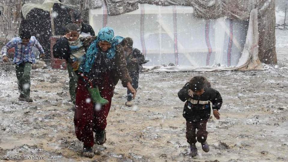 أطفال سوريون يهربون من برد الطقس فيما تتساقط الثلوج بغزارة