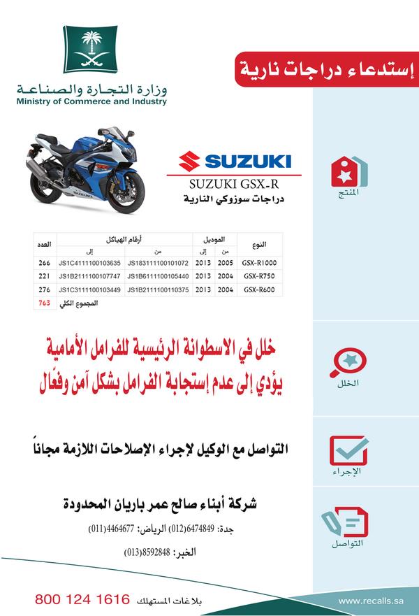 أعلنت وزارة التجارة والصناعة عن استدعاء 763 دراجة من طراز "سوزوكي"، لوجود خلل في الإسطوانة الرئيسة للفرامل الأمامية يؤدي إلى عدم استجابة الفرامل بشكل آمن وفعّال.