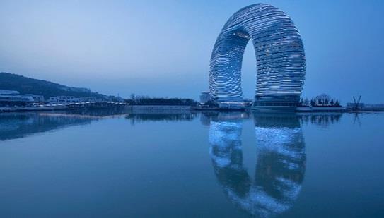 فندق ومنتجع "شيراتون هوتشو هوت سبرنج" في مدينة "شنغهاي" الصينية، ويضم 19 ألف وحدة إضاءة "LED" تنير هيكله الخارجي بالكامل ليلاً، وهو مُصمم على شكل دائري طولي، ويضم 27 طابقاً، و321 غرفة و44 جناحاً و39 فيلا.