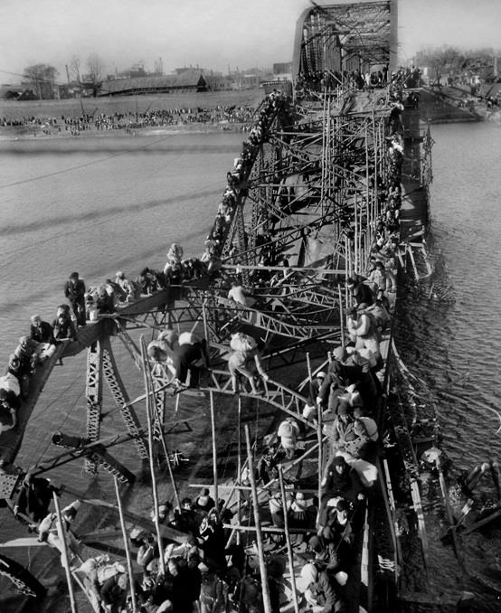 حازت هذه الصورة على جائزة "بوليتزر" عام 1955 لمصورها "ماكس ديسفور", وهي توضح فرار سكان مدينة "بيونغ بانغ" في كوريا الشمالية واللاجئين من مناطق أخرى إلى الجنوب, عبر نهر "تايدونغ", باستخدام جسر المدينة المُدمر, وذلك هربًا من غزو القوات الشيوعية الصينية .