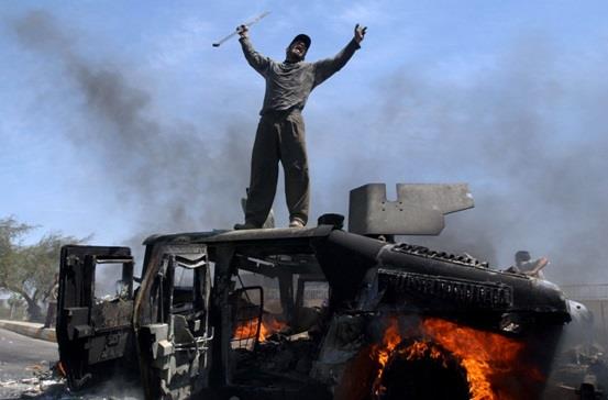 أما هذه الصورة فهي لعراقي يقف فوق مدرعة أمريكية مُحترقة احتفالاً بحرقها, في شمالي بغداد عام 2004، إبان الغزو الأمريكي للعراق، وقد التقط هذه الصورة, المصور الفلسطيني "محمد محيسن" والتي حازت على جائزة "البوليتزر" عام 2005 .