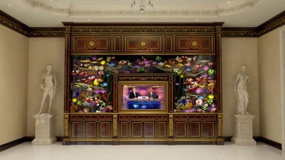 وتعد تلك الشاشة الكبيرة "Imax" إحدى وسائل التسلية والترفيه داخل القصر، ويحيط بها تمثالان من كل جانب فيها.