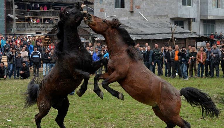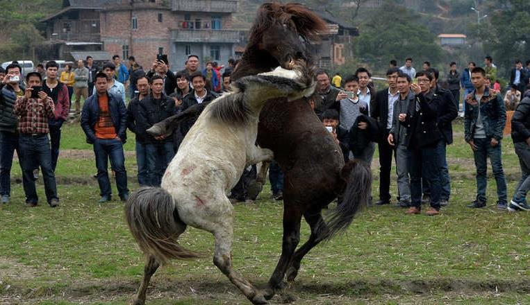 وتظهر الصور التالية الفحول التي تتقاتل خلال المعركة التقليدية للخيول في السنة الصينية الجديدة في قرية مياو في مقاطعة قوانغشى. ويمارس سكان قرية تيانتاو، النائية في مقاطعة قوانغشي، هذا التقليد البالغ من العمر 500، حيث تتقاتل الفحول ضد بعضها في معركة للفوز بالفرس. وتعتبر هذه الطريقة الوحيدة لبدء السنة القمرية الجديدة.