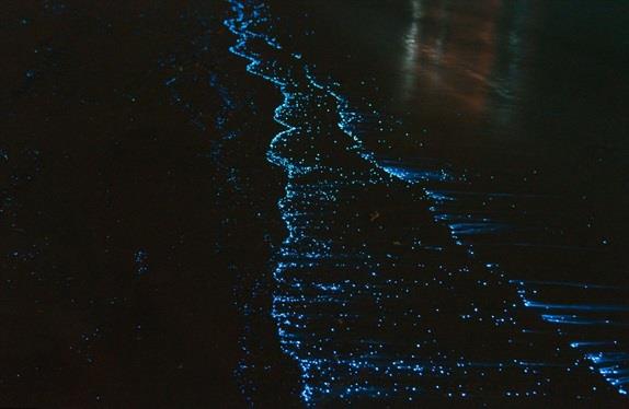 "شاطئ جزيرة فادو" في جزر "المالديف"، وتتكون على صفحة مياهه أشكالًا تشبه النجوم، وذلك بسبب العوالق النباتية المضيئة.