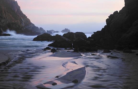 شاطئ "بفايفر" في ولاية كاليفورنيا، الذي يتميز برماله أرجوانية اللون، والتي يعود لونها إلى الرواسب المعدنية في التربة.