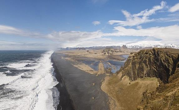 شاطئ من رمال البازلت الأسود، بالقرب من شبه جزيرة "ديرهولاي" Dyrholaey))، وهي جزيرة بركانية تكونت بفعل البراكين النشطة.