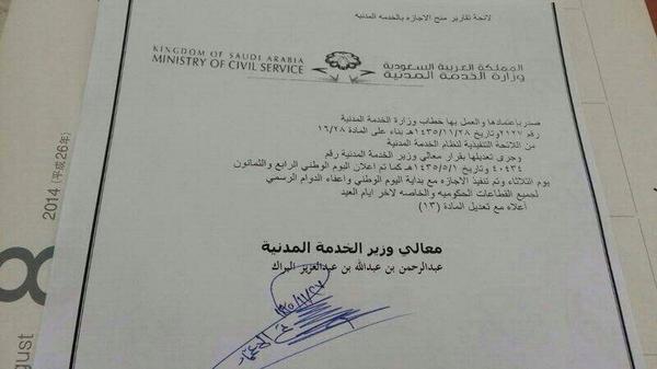 وكان مستخدمو مواقع التواصل الاجتماعي قد تداولوا صورة ضوئية لخطاب منسوب إلى وزارة الخدمة، يشير إلى موافقة وزير الخدمة المدنية على منح جميع موظفي القطاعين العام والخاص إجازة ابتداءً من اليوم (الثلاثاء) وحتى نهاية إجازة عيد الأضحى المبارك.