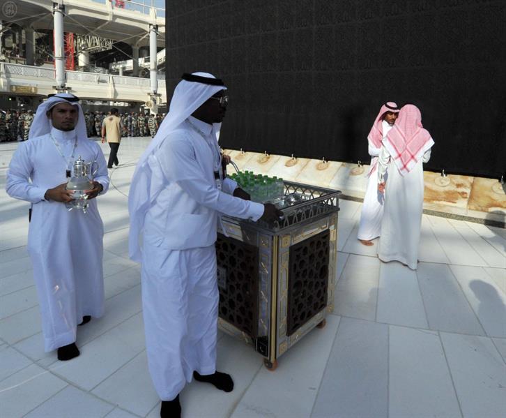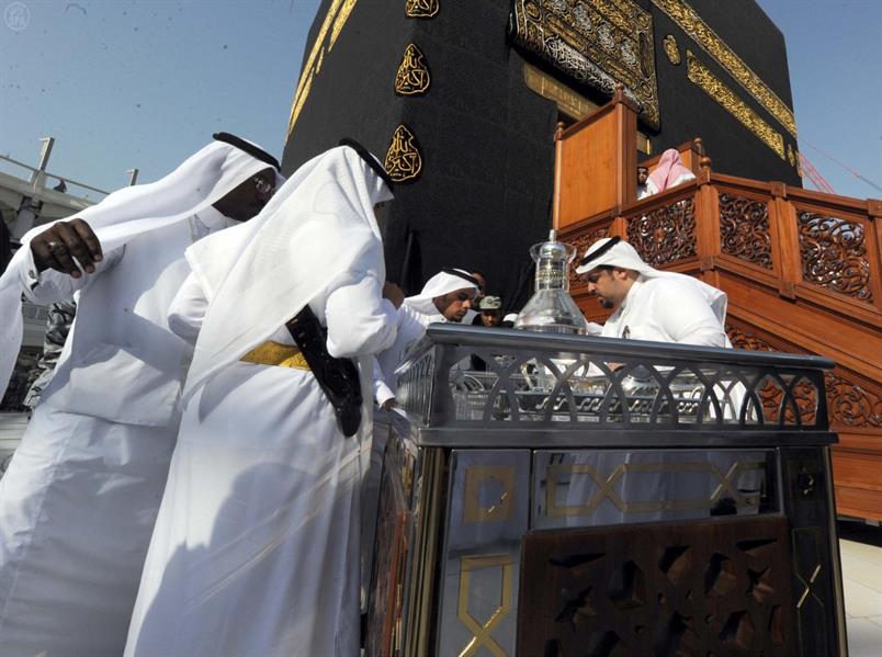 ويتم عادة غسل جدار الكعبة من الداخل بـ45 لتراً من ماء زمزم، و50 تولة من الورد الطائفي والعود الكمبودي الفاخر، باستخدام قطع قماش مبللة بماء زمزم الممزوج بدهن الورد.