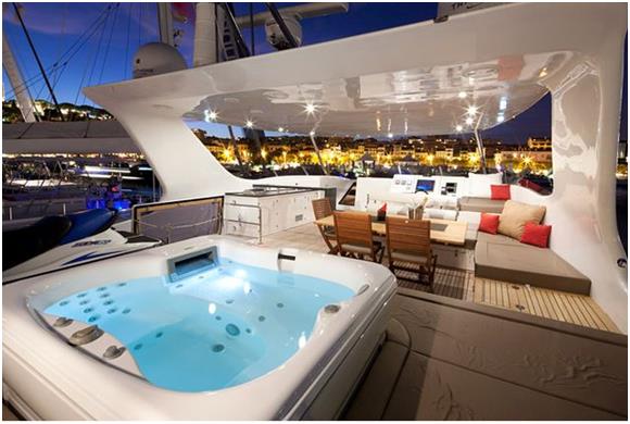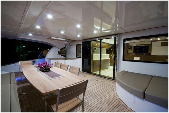 كما يشتمل سطح اليخت على طاولة طعام وأريكة للاسترخاء ومقاعد ومغسلة، إضافة إلى ثلاجة صغيرة.