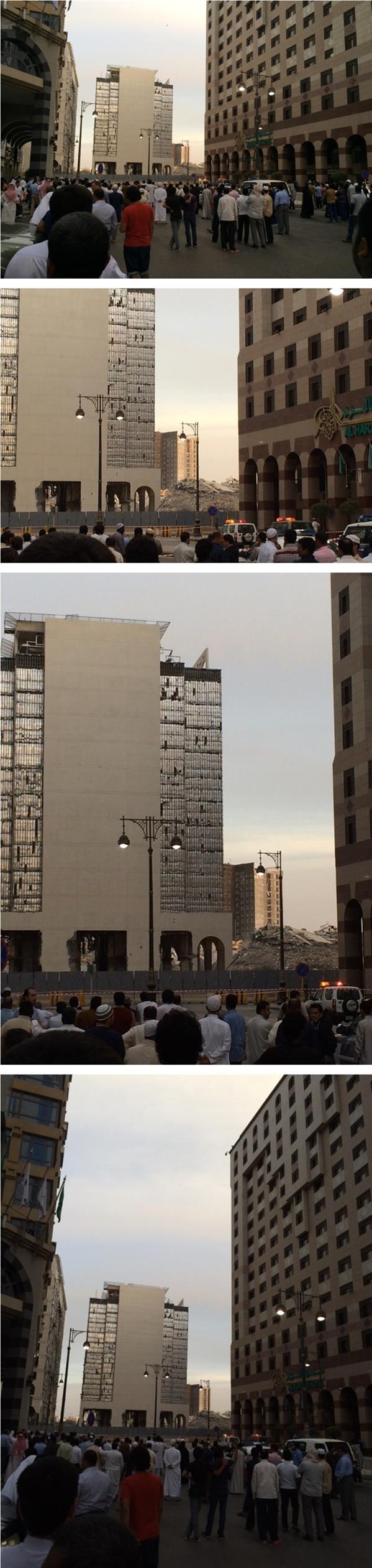 ونشرت "العربية نت" صوراً تظهر تجمعاً للزائرين بجوار المسجد حيث تم إخلاء المنطقة القريبة من الفندق المزمع هدمه بعد قليل بالكامل.