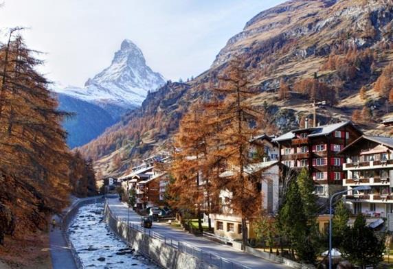 قرية زيرمات، وتقع في جنوب سويسرا على الحدود مع إيطاليا، وهي قرية سياحية صغيرة تتميز بموقعها ضمن جبال الألب، وتشتهر بكونها إحدى منتجعات التزلج على المنحدرات الجليدية، ويزورها عدد كبير من السياح في فصل الشتاء لممارسة هذه الرياضة، وجاءت في المركز الرابع بالقائمة.