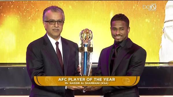 ناصر الشمراني أفضل لاعب في آسيا . . . . منح الاتحاد الآسيوي لكرة القدم، نجم المنتخب السعودي ونادي الهلال ناصر الشمراني، جائزة أفضل لاعب في القارة لموسم 2014، وذلك خلال الاحتفالية التي نظمها الاتحاد في العاصمة الفلبينية مانيلا، في الـ30 من نوفمبر الماضي، بمناسبة مرور 60 عاماً على تأسيسه.