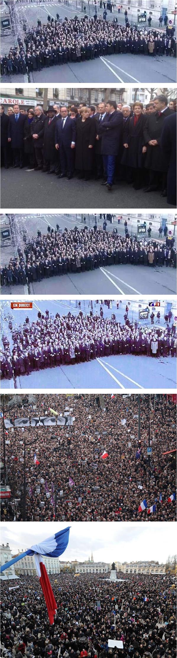 وكشفت لقطات حول قيادة المسيرة من قبل زعماء العالم، وردت في التقارير الإخبارية التي أذيعت على القناة الفرنسية، أن قادة المسيرة وخلفهم ما يزيد قليلا على عشرة صفوف من كبار الشخصيات والمسؤولين الآخرين، كانوا معزولين تمامًا وبمسافة كبيرة عن حشود المتظاهرين الآخرين، بواسطة قوات أمنية كبيرة.