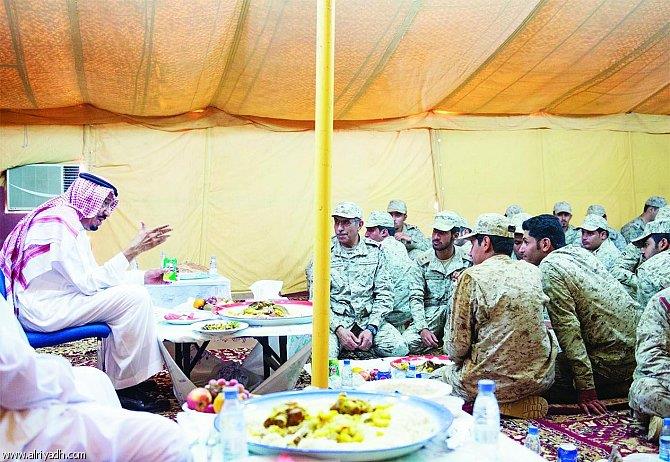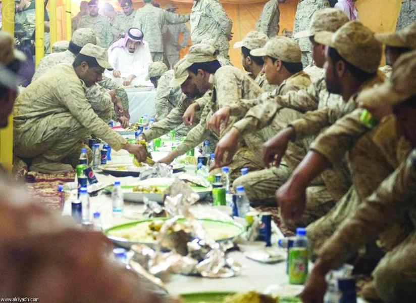 الملك سلمان يتناول الطعام مع أفراد القوات المسلحة خلال معايدته لهم.