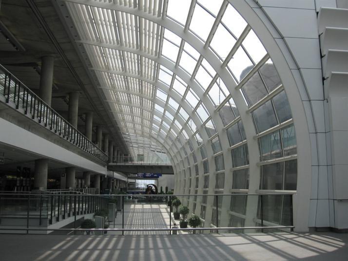 يعد واحداً من أكبر المباني في العالم وتم تصميمه بواسطة شركة "فوسترز آند بارتنرز"، يتميز بسقف زجاجي يسمح بدخول أشعة الشمس فضلاً عن أنه يضم حديقة خصبة بمساحة 28 ألف متر يمكن من خلالها رؤية الطائرات.