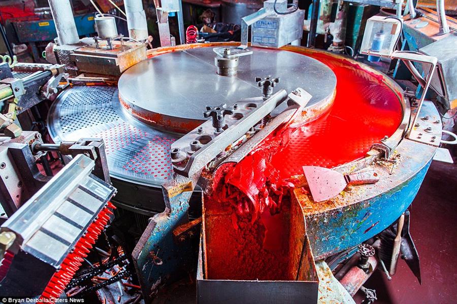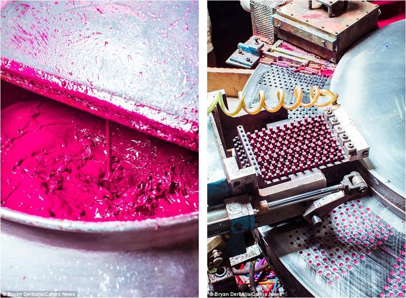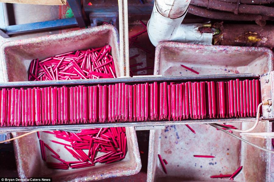بينما يتم ضغط البارافين داخل الماكينة لتشكيل الأقلام، يتم كشط الزوائد ليعاد تدويرها واستخدامها مرة أخرى