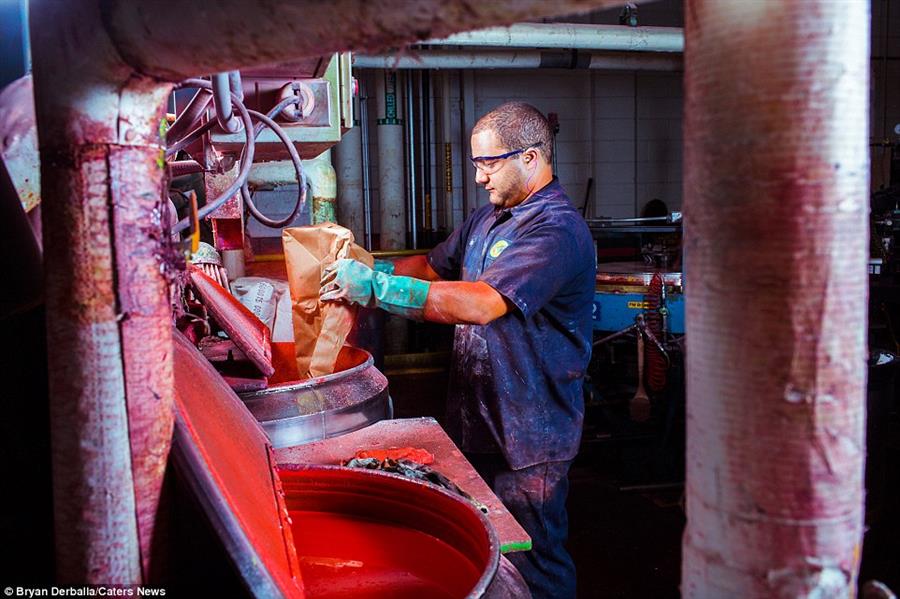 أحد العاملين في المصنع يضيف الأصباغ البرتقالية إلى "البارافين" لصناعة الأقلام