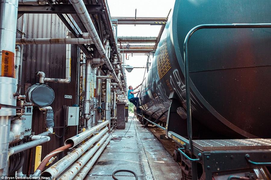 أحد عمال المصنع يصعد على عربة قطار لتفريغ شحنة أصباغ لاستخدامها في المصنع