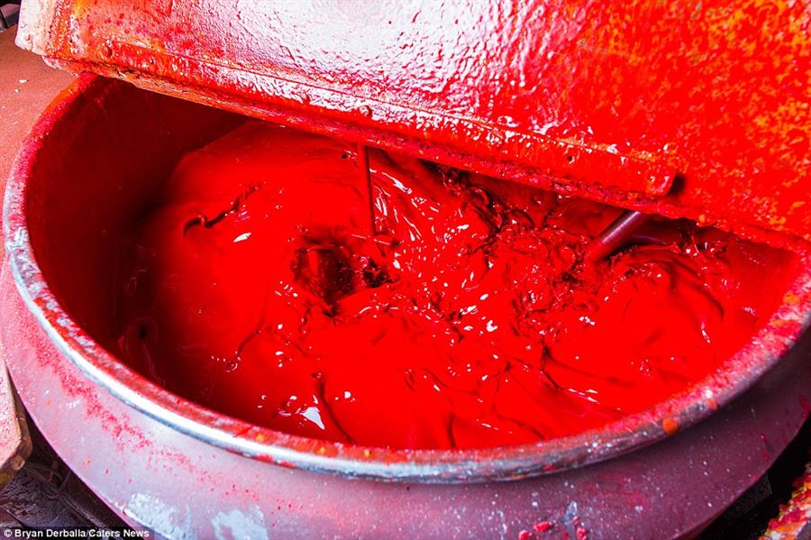 غلاية خلط كاملة لمادة البارافين وترى بودرة صبغة البرتقال، قبل صبها وتشكيلها في المصنع