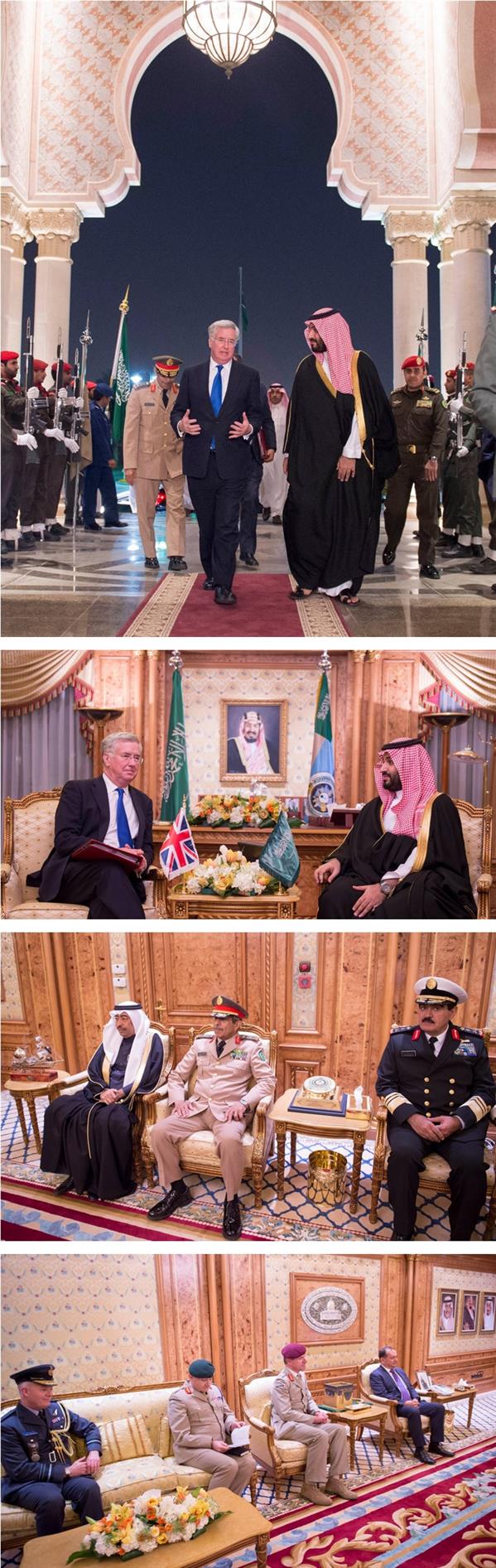 استقبل صاحب السمو الملكي الأمير محمد بن سلمان بن عبدالعزيز وزير الدفاع رئيس الديوان الملكي المستشار الخاص لخادم الحرمين الشريفين، في مكتبه بالمعذر مساء اليوم، معالي وزير الدفاع البريطاني مايكل فالون والوفد المرافق له.