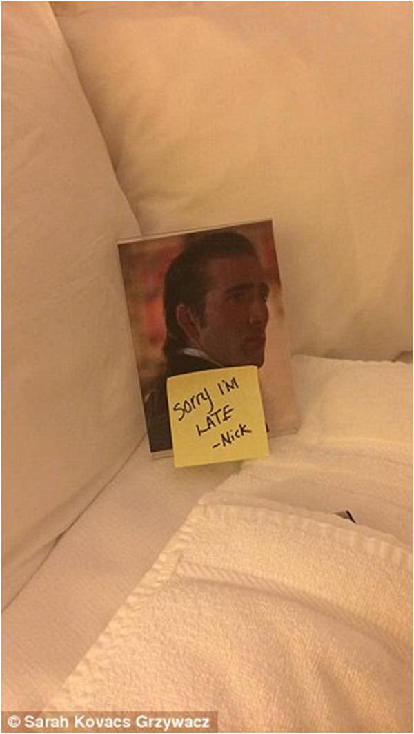 قامت نزيلة في فندق "إنديجو سان أنطونيو" في ولاية تكساس الأمريكية, بطلب توفير غرفة مليئة بعدة صور للممثل الأمريكي "نيوكولاس كيدج" على أن تكون موقعة منه شخصيًا.