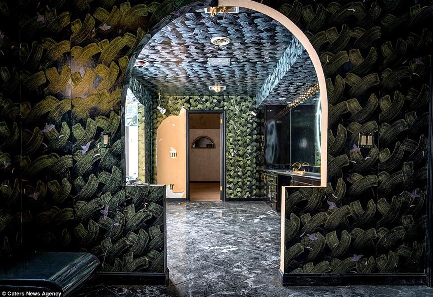 صورة أخرى لغرفة الجاكوزي ويبدو فيها الرخام والذهب، كما يظهر تساقط بعض ديكور الجدران، وتشويهها بالأصباغ
