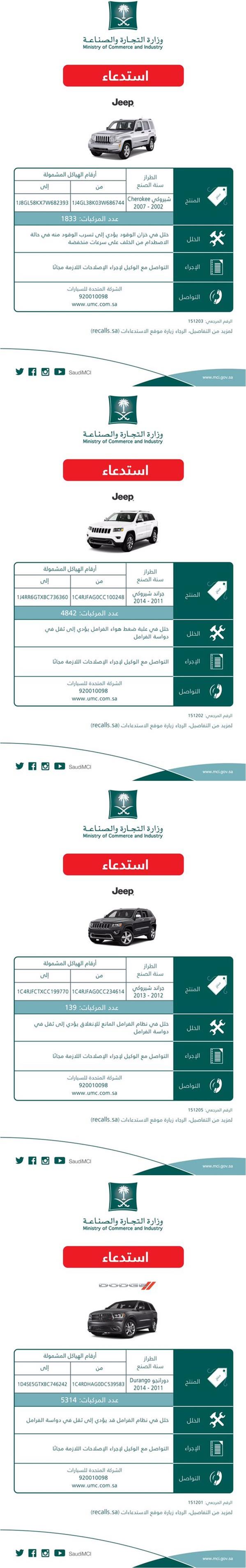 وأوضحت الوزارة أن الموديلات التي تم استدعاؤها من سيارات جيب "شيروكي" ترجع لموديلات 2002 حتى 2007 وعددها 1833 سيارة لخلل في نظام الوقود، أما سيارات جيب "جراند شيروكي"وعددها 4981 مركبة، فترجع لموديلات 2011 – 2014 بسبب خلل في نظام الفرامل.