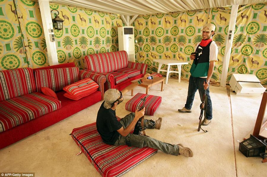 نشر الثوار هذه الصورة للخيمة الشهيرة داخل قصر العزيزية والتي اعتاد القذافي استقبال رؤساء الدول وعقد اجتماعاته معهم فيها