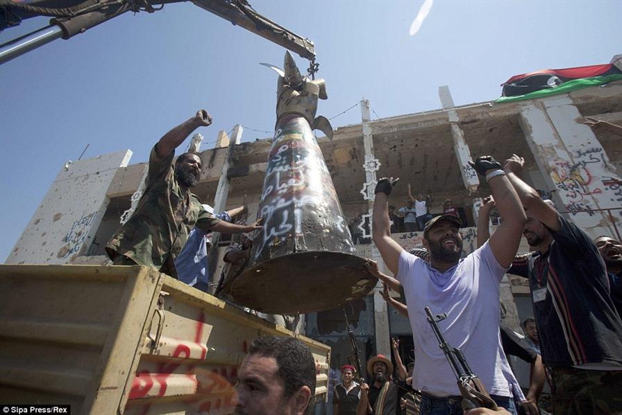 بعد السيطرة على القصر عام 2011، استخدم الثوار رافعة لإزالة مجسم لقبضة اليد وهي تمسك بطائرة أمريكية، كان موجودًا خارج مبنى القصر